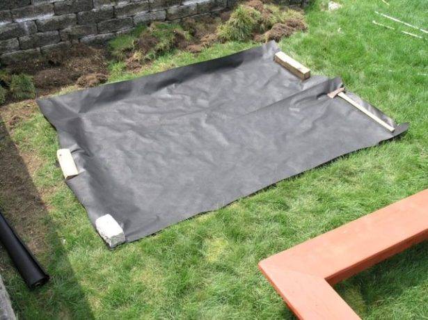 - Hacer una caja de arena para niños comienza con la preparación del fondo del pozo. Anteriormente, ya estaba cubierto con una capa de drenaje, ahora es necesario cubrirlo con geotextiles o agrofibra densa. A veces, para estos fines, se utiliza una película negra, perforada con un clavo para el drenaje. Puede hacer esto, pero esta no es la mejor opción. La humedad en las cavidades sin agujeros persistirá y se desarrollará moho.