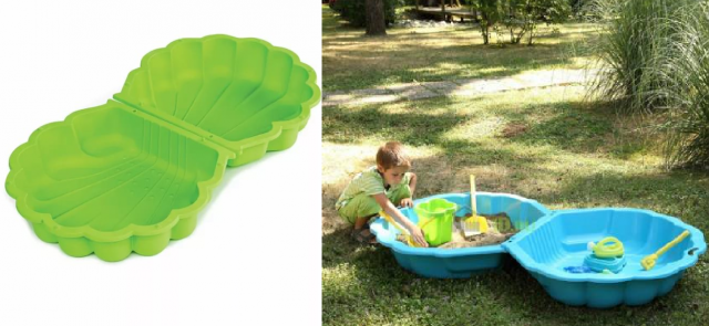 Los areneros de conchas también son populares en familias con dos niños pequeños. Cuando los abres, obtienes dos mitades interconectadas equivalentes, que se pueden usar como caja de arena o piscina. La dificultad de usar tales cajas de arena es que cada vez que finaliza el juego, la arena deberá verterse manualmente en la mitad del caparazón para cerrarla.