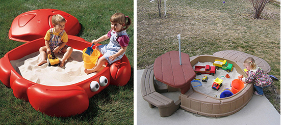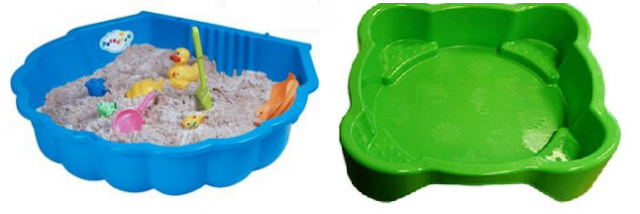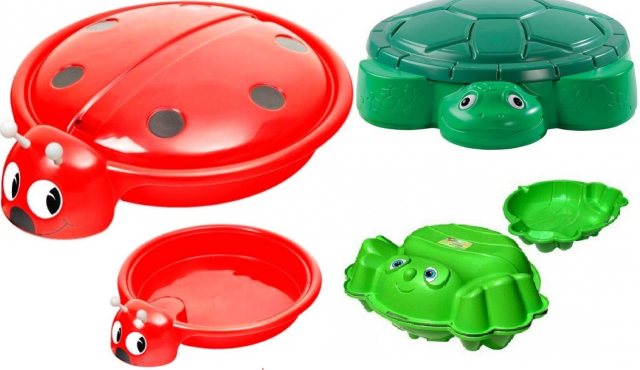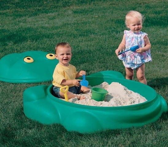 Una versión un poco más compleja de la caja de arena es un recipiente de plástico y una tapa. Puede encontrar una opción de este tipo en forma de animales, por ejemplo, una tortuga o una rana. El marco también se puede usar no solo para arena, sino también para agua, creando así una pequeña piscina.