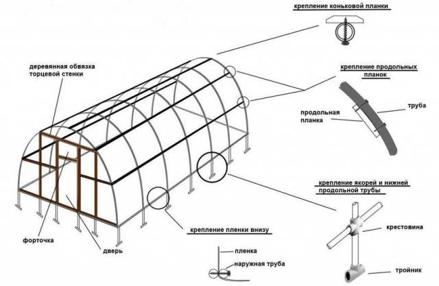 La forma más fácil es construir un invernadero a partir de espacios en blanco comprados. Las tuberías de polipropileno vienen en un conjunto cortado a un cierto tamaño con sujetadores y accesorios. Abajo en la foto se puede ver un dibujo de uno de estos invernaderos. El marco se ensambla como constructor. No se requiere una base para ello, es suficiente solo para nivelar el sitio. Si un invernadero está hecho de tubos de plástico con sus propias manos, aquí tiene la oportunidad de elegir un tamaño individual.