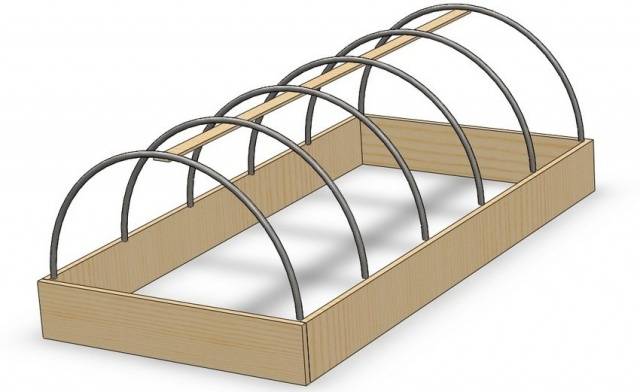 - Los tubos de plástico se doblan en un arco, colocándolos en las varillas martilladas de las paredes opuestas. Cada extremo inferior de la tubería se fija con abrazaderas metálicas a una caja de madera. Los refuerzos se colocan a lo largo del esqueleto ensamblado a lo largo de todos los arcos. En el futuro, jugarán el papel de una caja. La conexión de estos elementos se realiza con abrazaderas de plástico.