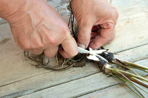 Las parcelas de siembra obtenidas como resultado de dividir un arbusto de un área de captación de adultos se llevan a cabo en pozos preparados. Los arbustos mayores de 4-5 años se desentierran y se dividen en partes con un cuchillo afilado para que cada uno contenga más de 3 brotes viables. Este método de plantación le permite propagar plantas con la preservación completa de las características varietales de las formas, tamaños y características de color de los pétalos. Después de colocar las parcelas en los agujeros, las plantas se presionan y se rocían con tierra, se humedecen completamente.