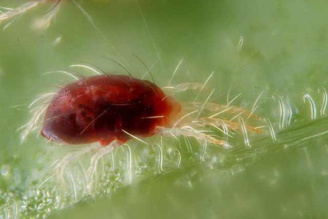La araña roja se asienta en la parte inferior de las placas de las hojas.
