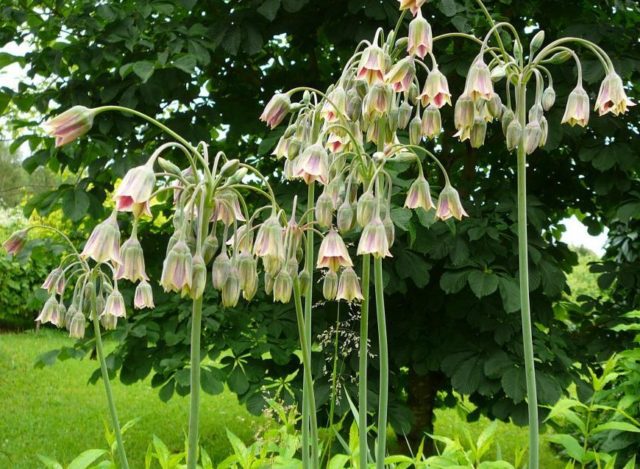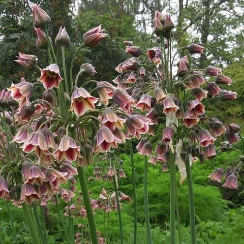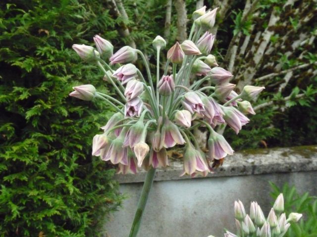 Las cebollas búlgaras crecen hasta 90 cm de altura. La floración comienza a finales de junio. En los brotes, aparecen 20-30 pequeñas flores de color rosa pálido o rojo oscuro. La floración no dura más de un mes, pero incluso las flores marchitas se pueden usar para componer composiciones florísticas. Allium se caracteriza por una resistencia satisfactoria al invierno, pero en las regiones con inviernos helados, no solo se necesitará un acolchado de raíces, sino también una cubierta de arpillera.