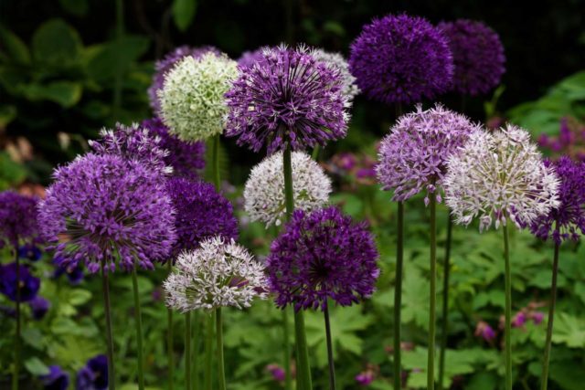 Allium atraerá la atención si se planta en el contexto de una vegetación de jardín brillante.