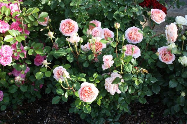 Abraham Derby se usa a menudo en mixborders. Se colocan en segundo plano. En el frente se plantan plantas herbáceas de bajo crecimiento con floración temprana. El abundante follaje de rosas les sirve de fondo.