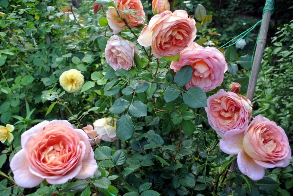 Rose David Austin Abraham Derby: el resultado del cruce entre especies. Las variedades Aloha y Yellow Cushion se utilizaron en trabajos de mejora.