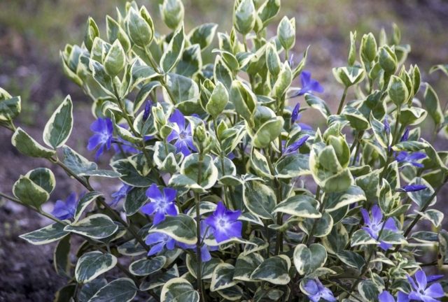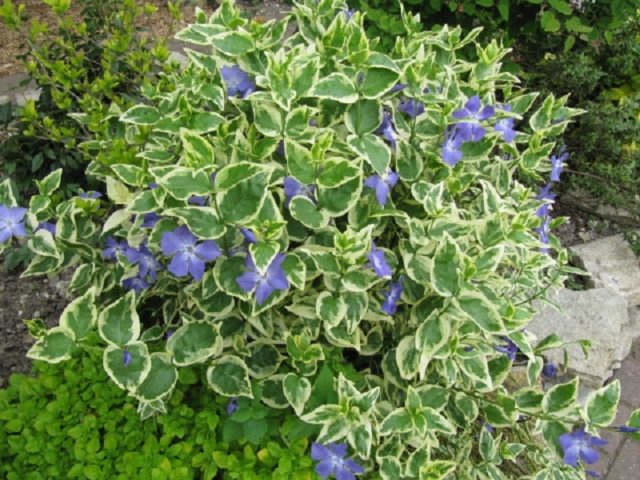 Periwinkle great Variegata se siente genial en sombra parcial. En matorrales densos, también sobrevivirá, pero no florecerá, el color abigarrado de las hojas desaparecerá.