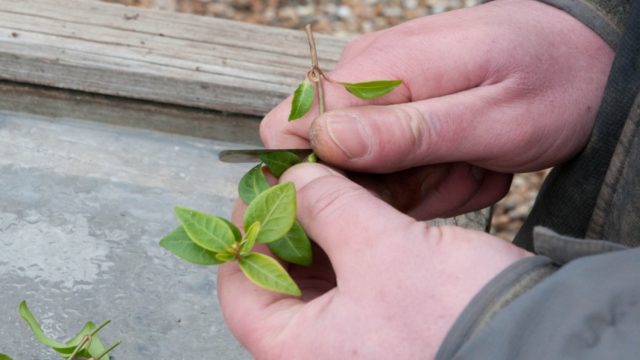 El tallo es la punta de un vástago de bígaro de un Variegat grande, de unos 20 cm de largo, el corte inferior se realiza en un ángulo de unos 45 °, y también se quita la mitad de cada hoja. Espolvorea la base del esqueje con cualquier estimulante de raíces en polvo.