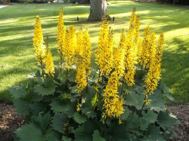 El Buzulnik siberiano puede convertirse en una decoración de jardín incluso sin otra vegetación alrededor.