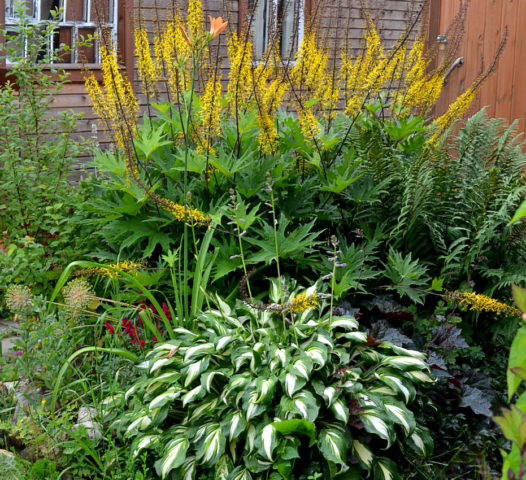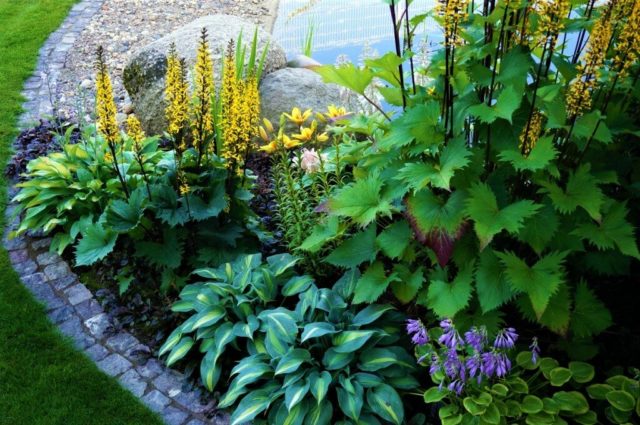 La composición de varios niveles será original, en la que junto al buzulnik siberiano habrá un arbusto o flores más bajos.