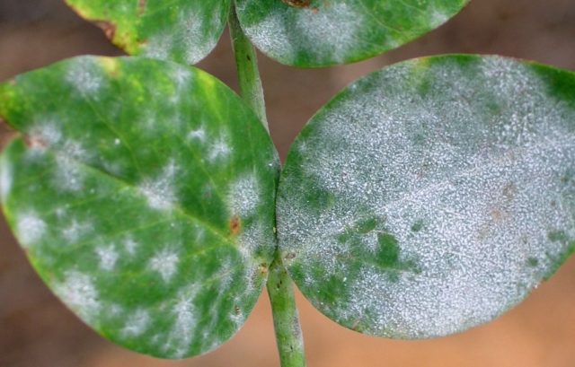 - Moho polvoriento... El primer signo de enfermedad son las manchas foliares. Son fáciles de lavar, pero esto no evitará que vuelvan a aparecer. Además, las hojas inferiores están cubiertas de manchas marrones, gradualmente la enfermedad pasa a la parte superior de la planta. Las áreas afectadas se secan y mueren, lo que conduce a la muerte del cultivo. La enfermedad se puede prevenir mediante la pulverización profiláctica con azufre o suero de leche (tres veces por temporada). El aderezo con fertilizantes de fósforo y potasio durante el período de floración aumentará la inmunidad de la planta a las enfermedades. En caso de daño, se utilizan preparaciones fungicidas, de acuerdo con las instrucciones.