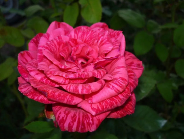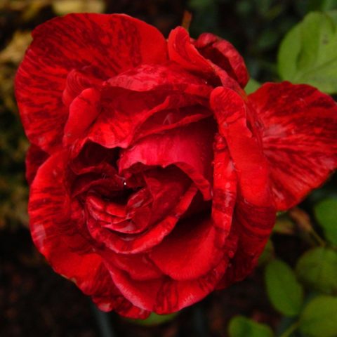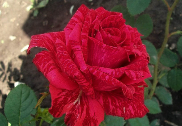 Las flores son de copa, de color de granada burdeos a carmesí, pero no monocromáticas; rayas rojas con bordes difusos, motas, líneas a lo largo de la superficie de los pétalos. Los colores inusuales agregan originalidad a la rosa. Las flores son de rizo, constan de 45 pétalos, de tamaño mediano y grande con un diámetro de 9-12 cm, con una superficie aterciopelada. En el tallo, hay principalmente 1 yema, pero ocurre, aunque raramente, más. Hay un sutil aroma agradable. La floración de la variedad dura de junio a julio, de forma casi continua.