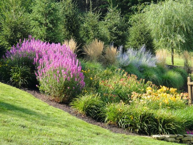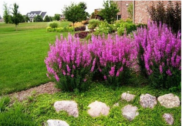 La salicaria es muy decorativa, por lo que se utiliza a menudo en plantaciones individuales. La foto muestra varias opciones originales para el uso de la salicaria en forma de varilla: