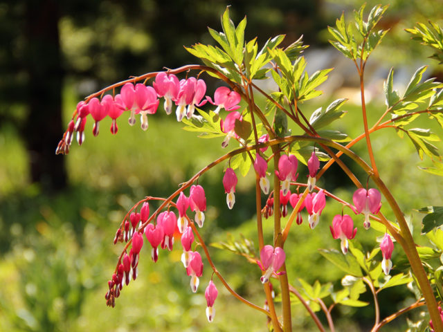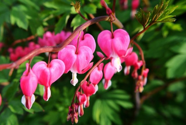 - La dicentra, plantada a la sombra, florece bastante tarde, pero al mismo tiempo se distingue por su color brillante y su larga duración de floración. Por lo tanto, el jardín en el que se planta el dicenter agrada a la vista con tonos multicolores hasta mediados del verano.