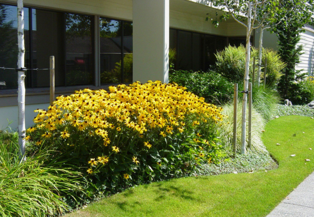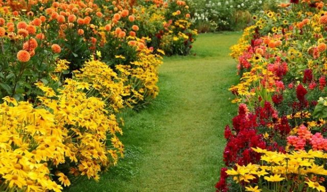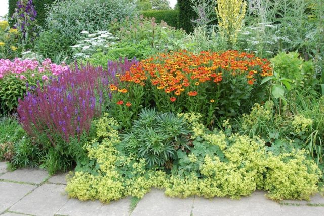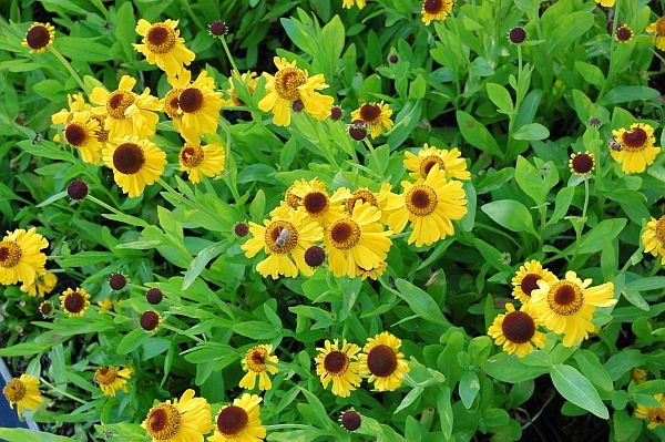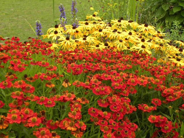 En la foto se muestra un buen ejemplo de una combinación de helenio perenne y flores complementarias: