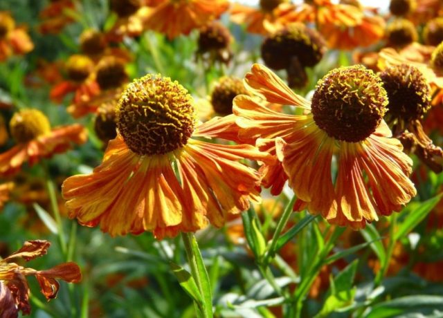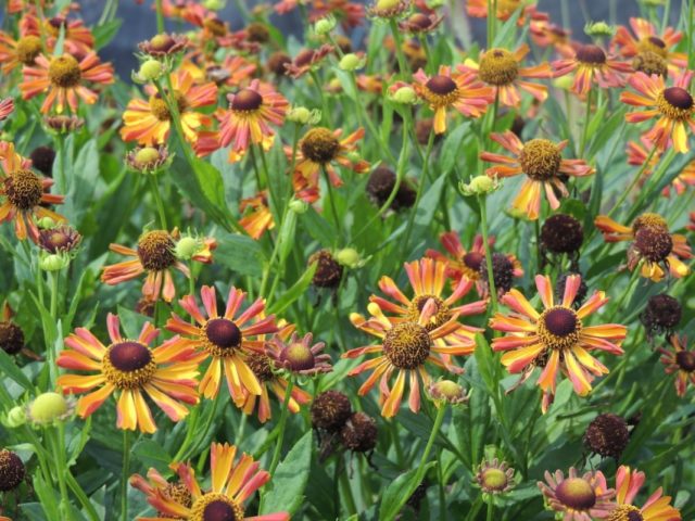 Las inflorescencias del helenio perenne son complejas, corimbosas, formadas en la parte superior de los brotes. Su diámetro es de 6-8 cm. Las flores marginales y liguladas tienen una forma alargada con 3 dentículos a lo largo del borde exterior. Están ligeramente dobladas desde la parte central en forma de "cono" o hemisferio formado por flores tubulares. Exteriormente, la inflorescencia se parece un poco a una manzanilla, pero con un núcleo convexo.La paleta de colores perennes helenium es rica: todo tipo de tonalidades de tonos rojos, naranjas, amarillos y marrones, así como sus combinaciones. Entre la diversidad varietal, hay híbridos con inflorescencias semidobles y dobles.