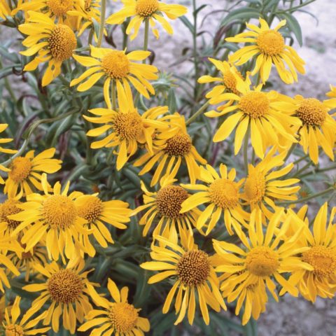La altura de los brotes de Helenium hoopesii (lat. Helenium hoopesii) es de unos 90 cm. Las hojas de la planta son enteras, alargadas, de color gris verdoso. Las inflorescencias son muy grandes (8-10 cm de diámetro), solitarias, sobre pedúnculos largos. Las flores de caña y tubulares son de color amarillo brillante. Aparecen en abundancia de junio a julio.