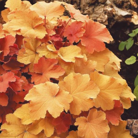 Una gama brillantemente saturada de hojas espectaculares de una hierba perenne, heuchera, puede decorar cualquier jardín de flores o mixborder. Da una extraordinaria ligereza y delicadeza a las composiciones de macizos de flores, por lo que es apreciado por los diseñadores de paisajes. Hybrid Heuchera Caramel conserva su carácter pintoresco durante la temporada de crecimiento y se ve muy bien en plantaciones grupales, en composiciones de paisajes increíblemente hermosas.