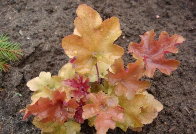 Heuchera Caramel se planta en suelo fértil en pequeños pozos de siembra con una capa de drenaje de guijarros y arena de río. La tierra debe calentarse, por lo que el aterrizaje está programado para fines de abril o principios de mayo, según la región y las condiciones climáticas. Para la siembra en grupo, la distancia entre los geychers se mantiene entre 25 y 30 cm.