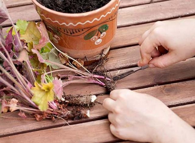 En mayo o agosto, se puede plantar heuchera rojo sangre dividiendo el arbusto. Se desentierra una planta profusamente derramada y el rizoma se divide en partes separadas con un cuchillo afilado. En cada parcela, quedan raíces jóvenes y sanas y una roseta de hojas formada. Las plántulas se plantan inmediatamente en un lugar permanente, evitando que el sistema radicular se seque.