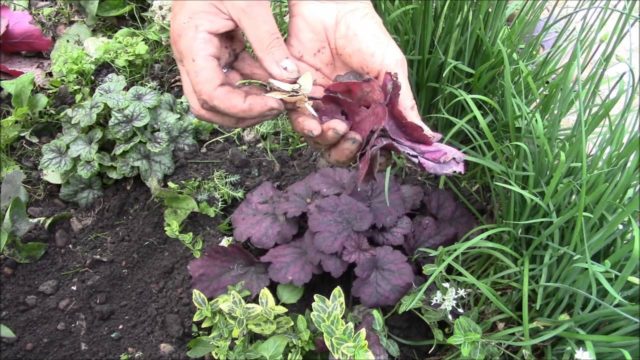 En el fondo de los pozos de siembra con un diámetro de 30x30, se debe colocar una capa de drenaje de arena de río y arcilla fina expandida. A continuación, se vierte el suelo fértil preparado y se entierran los rizomas de heuchera rojo sangre hasta el comienzo de la roseta de hojas. Se agrega tierra fértil desde arriba, se apisona ligeramente y se riega.