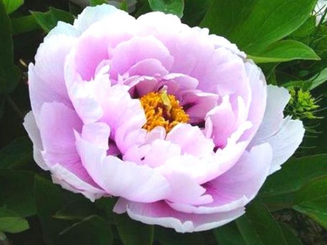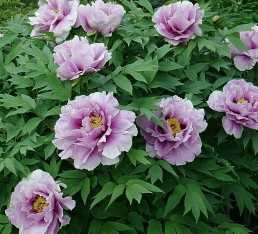 La peonía con forma de árbol tiene flores lujosas, densamente dobles con un diámetro de 17-19 cm. El arbusto es vigoroso, poderoso, de 1,7 a 1,9 m de altura. Florece exuberantemente, pero por un tiempo relativamente corto, hasta 7-10 días. . Los pétalos son de color violeta claro, delicado color lavanda, a lo largo del borde con un delicado tinte azulado.