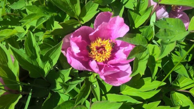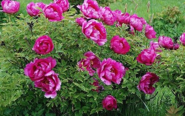 La peonía, parecida a un árbol, resistente al invierno, crece hasta 1,3-1,6 m. En la parte superior de los brotes fuertes, se balancean asombrosas capas de pétalos carmesí oscuros, que a veces sorprenden con el desbordamiento de tonos azul lila. La planta prefiere un suelo alcalino drenado rico en nutrientes.