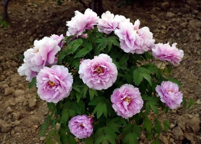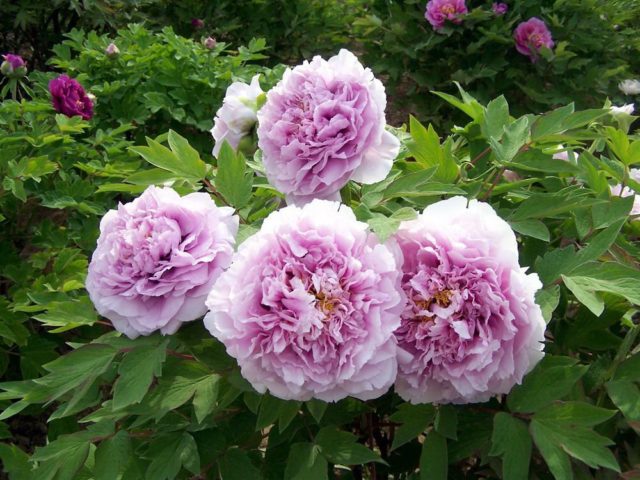 Las peonías de árboles de crecimiento fuerte son especialmente decorativas. Las plantas de colores contrastantes o armoniosos actúan como socios de especies con tonos azules de pétalos de color lila-rosa: