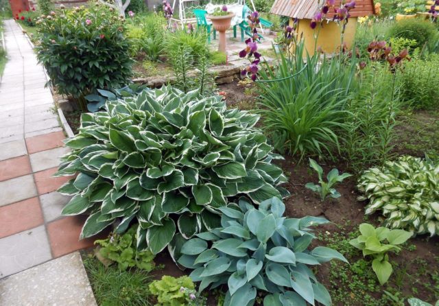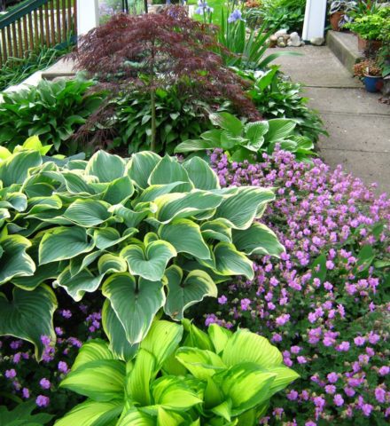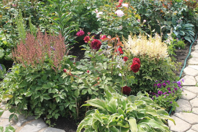 Lirios, peonías y anfitriones se complementan favorablemente.
