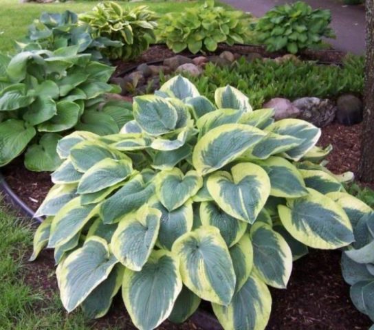 - La superficie es corrugada, la parte central está pintada en verde claro con un tinte azul pronunciado, el marco es blanco o beige. Hosta American Halo pertenece a la variedad variegada.