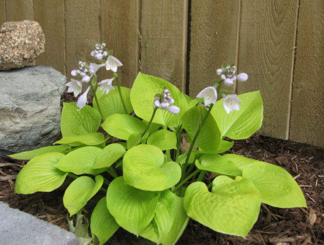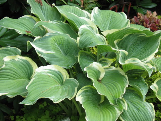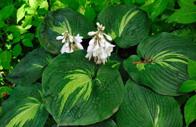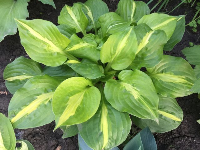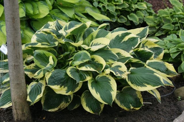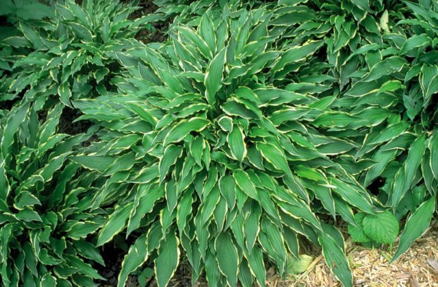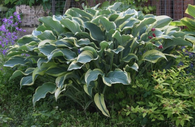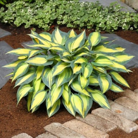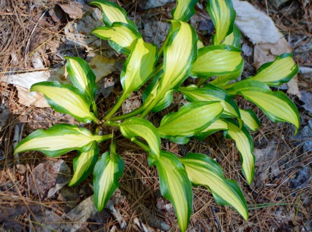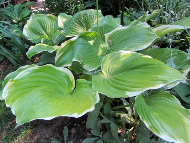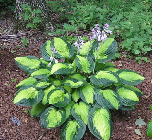 Esta hosta híbrida forma un arbusto corto de hasta 40 cm y unos 60-70 cm de diámetro y se caracteriza por la variabilidad de color. En primavera, las placas son de color verde con un borde amarillo en el borde; en verano, su encuadre desaparece. Se desarrolla bien en sombra parcial y en áreas moderadamente húmedas. La floración se produce a principios de agosto.
