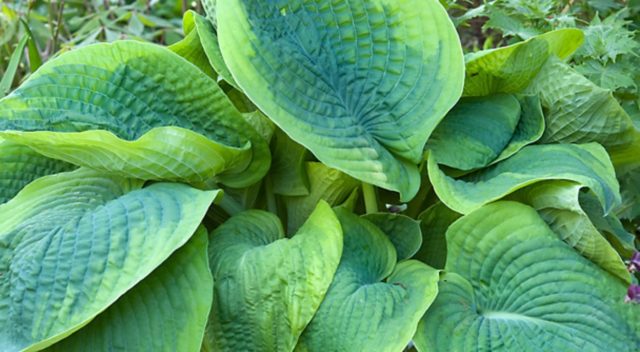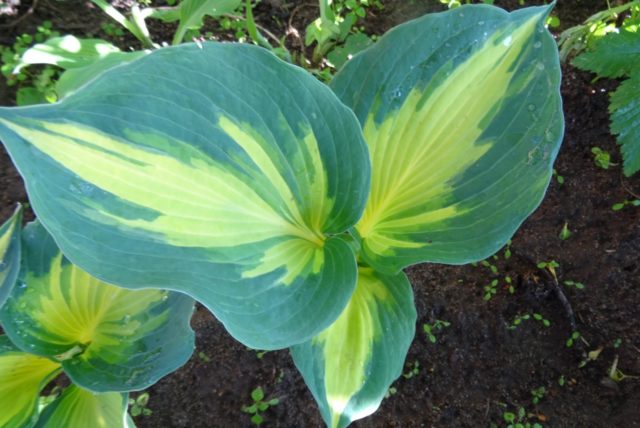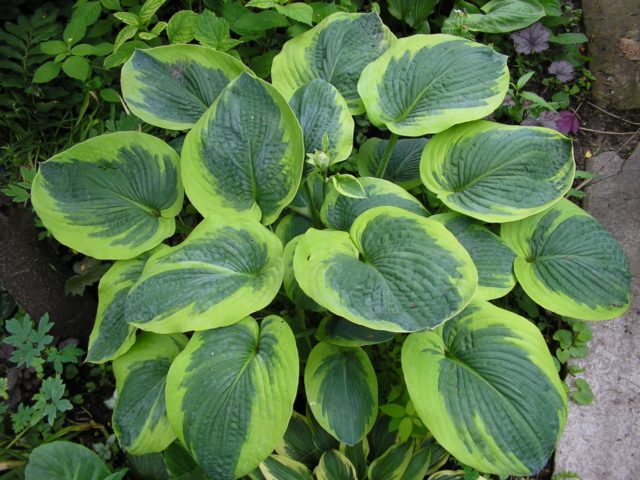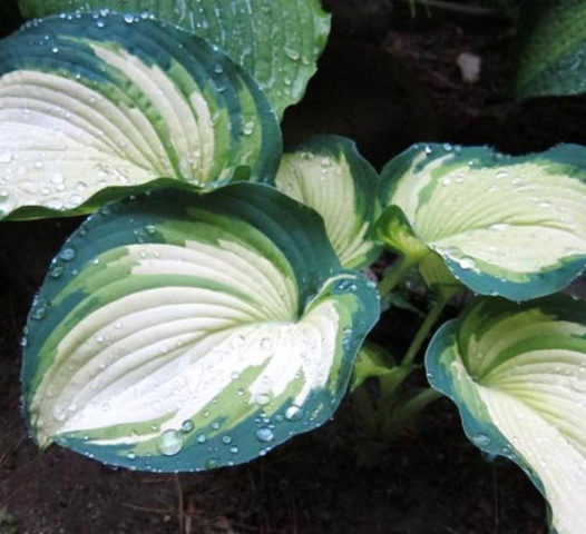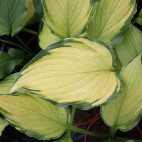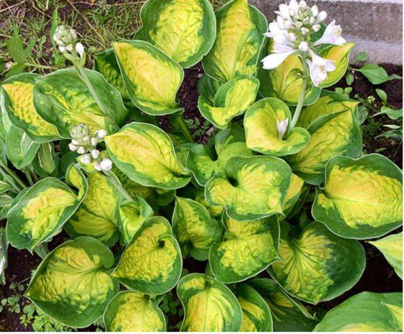 Un tipo común de hospedadores híbridos. Se caracteriza por hojas densas con venas en relieve pronunciadas. En la primavera, durante la temporada de crecimiento activo, la parte central de las placas es amarilla y, a mediados del verano, se vuelve blanca cremosa. Hay un borde azul verdoso a lo largo del borde. La altura del arbusto alcanza los 50-60 cm y su diámetro es de 70 cm.