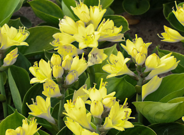 Cuando las hostias de Mango-Tango se plantan en un área abierta, las hojas adquieren un tinte dorado.