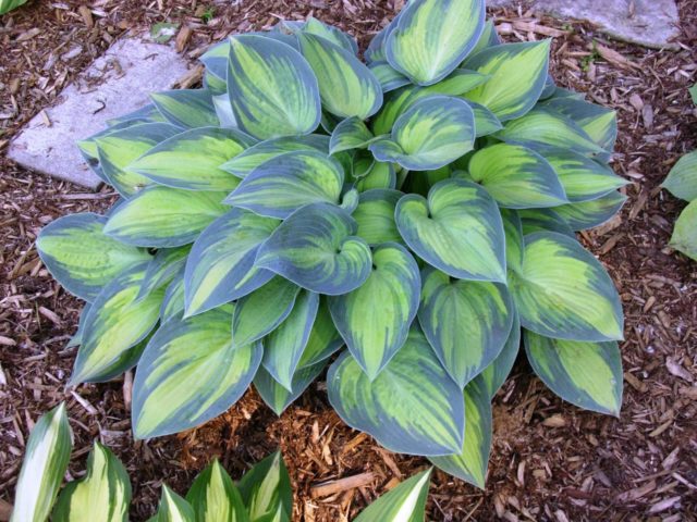 Especie de hosta híbrida de tamaño mediano. La altura y el ancho de la planta es de unos 50 cm y se caracteriza por un color tricolor. En el centro de la placa, el tono es amarillo verdoso y, más cerca del borde, se convierte suavemente en un marco gris azulado.