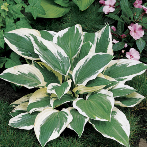 Especie extraordinaria, que fue criada en 1991. Se caracteriza por arbustos compactos, su altura no supera los 40 cm y su ancho es de 60-70 cm, las hojas son ovaladas, de color verde oscuro con un borde blanco irregular. Las placas miden 18 cm de largo y 13 cm de ancho y la floración se produce a finales de junio.