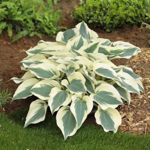 Esta variedad de hospedadores híbridos se crió en 1979 y sigue siendo relevante. Forma un arbusto de altura media, de unos 50 cm. Hojas grabadas, de color verde claro con un marco blanco a lo largo del borde del plato.