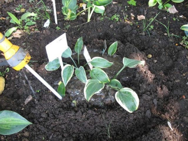 Humedezca la hosta con cuidado alrededor del arbusto para no dañar las raíces.