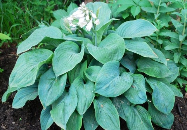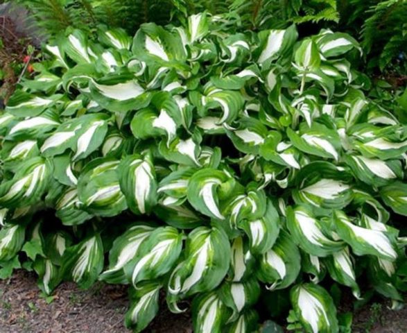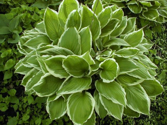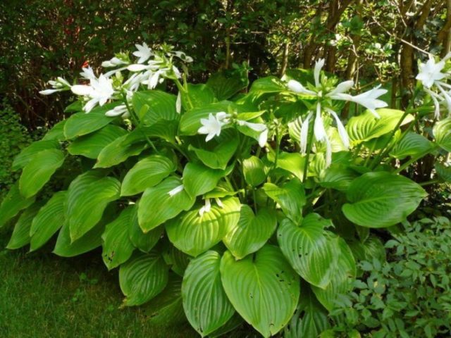 - Estándar real... Hosta de tamaño mediano, de unos 70 cm, tiene hojas verdes ovaladas. En agosto, la planta produce numerosas flores blancas como la nieve con olor a jazmín, que duran hasta octubre.