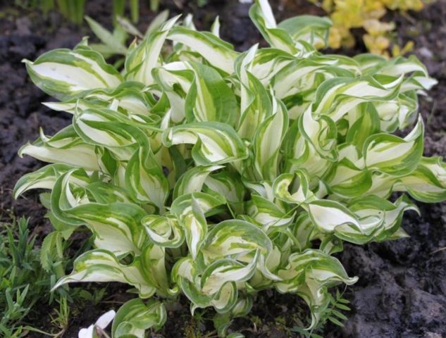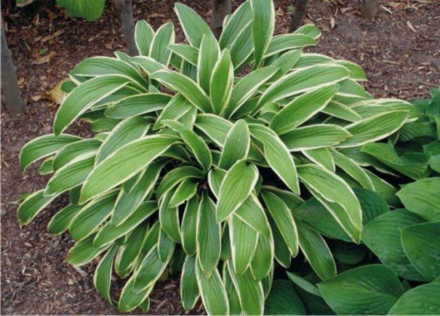 - Little Taft junto al lago... La planta se eleva hasta 25 cm sobre el suelo, sus hojas son alargadas, ligeramente onduladas, con una punta puntiaguda. En primavera, las placas de las hojas son de color verde claro en los bordes y amarillentas en el centro, y en verano se vuelven blanquecinas en el medio y verde brillante en los bordes.