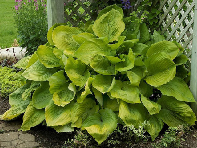 - Costa a costa... Una planta perenne de tamaño mediano se eleva 90 cm, tiene hojas en forma de corazón con una superficie ondulada y pequeñas olas hermosas a lo largo de los bordes. La sombra de las placas de las hojas es de color verde amarillento.