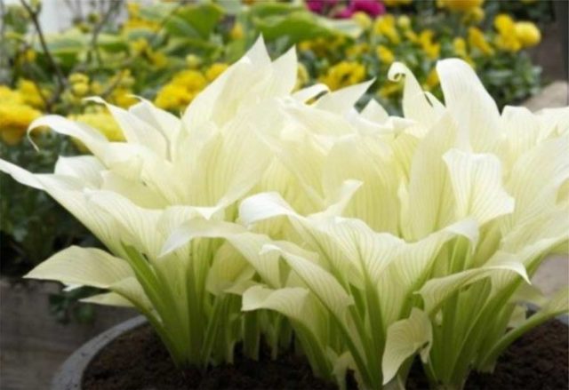 La dignidad de los huéspedes con flores es su mayor efecto decorativo. Estas variedades se pueden utilizar más ampliamente combinándolas con plantas que florecen en el mismo período.