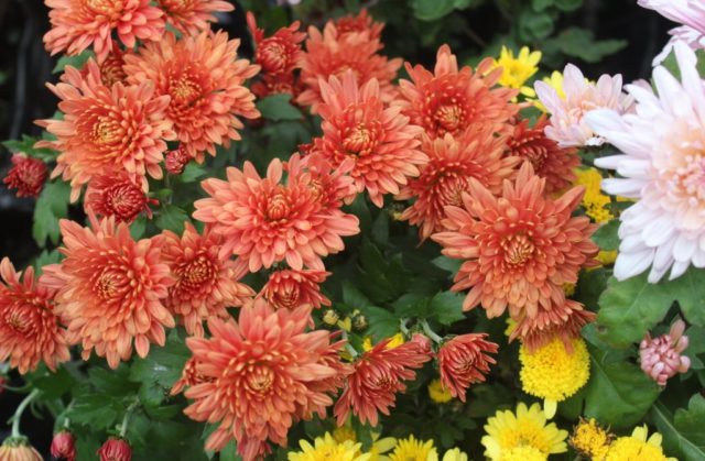 También hay variedades del crisantemo Indian Artist con flores de color amarillo-marrón y rojo anaranjado.