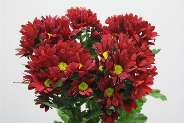 Esta variedad de crisantemos indios se puede cultivar tanto en maceta como en exterior. Los brotes lisos, rectos y bastante potentes de la planta forman un arbusto denso de aproximadamente 0,5 m de altura, cuya cesta de flores está formada por pétalos rojos que rodean un núcleo verde-amarillo.