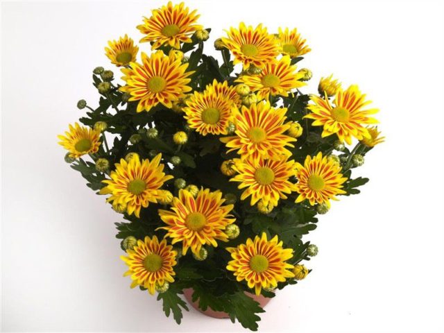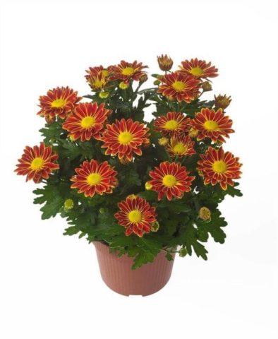 Se trata de una variedad de crisantemos en maceta que se convierte en un pequeño arbusto compacto de no más de 0,3 m de altura, cuyo rasgo distintivo es el color bicolor de los pétalos en forma de franjas longitudinales.