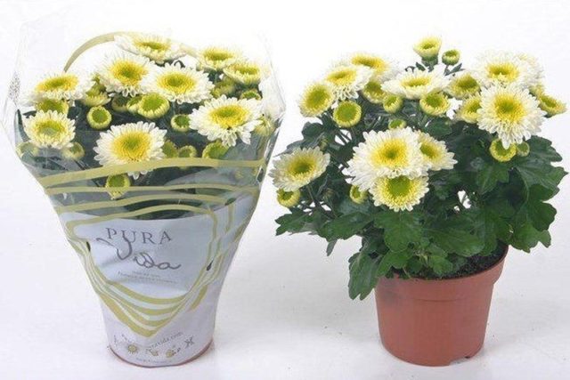 Como muchas otras variedades de crisantemos indios, Pura Vida se cultiva más comúnmente en macetas. La altura del arbusto no excede los 0.25-0.3 m. Los pétalos en la parte central de la inflorescencia son de color verde brillante, más cerca del borde adquieren el color de la lima, el borde es blanco.