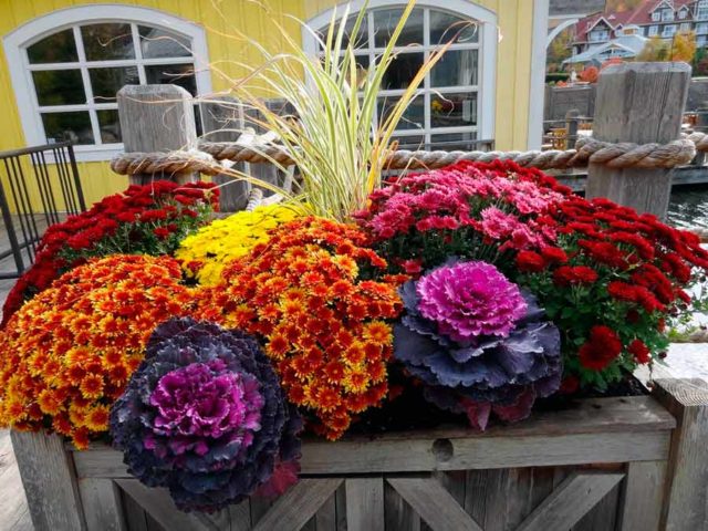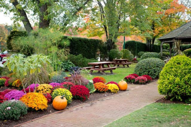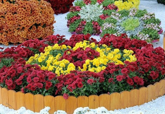 Una cama de flores alta improvisada con crisantemos se ve muy bien como elemento de decoración del jardín