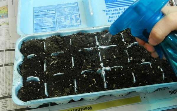 Después de plantar las semillas y antes de brotar, el suelo se humedece con mucho cuidado rociándolo con una botella de spray. Esto debe hacerse a medida que se seque la capa superior del suelo.