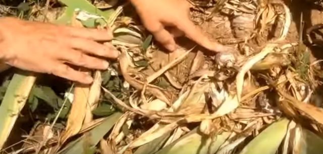 - El suelo alrededor del iris está compactado, lo hacen con cuidado para no dañar los cogollos, lo riegan.