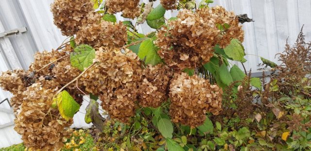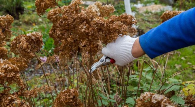 La poda de arbustos en el otoño se realiza bastante tarde. En la región de Moscú, se recomienda comenzar a cortar hortensias antes del invierno en la segunda quincena de octubre o incluso más tarde, a principios de noviembre.